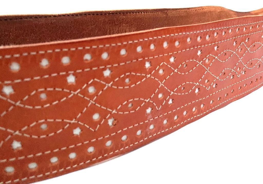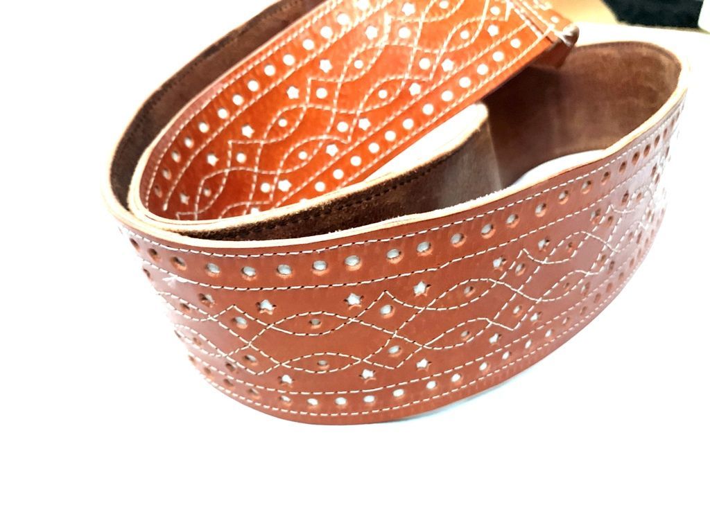 Bandolera  semirrígida para Tamboril de cuero marrón vacuno, calado en blanco y forrado en cuero.