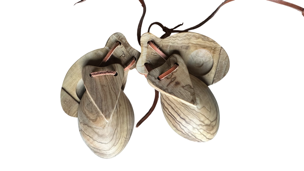 Este tipo de castañuelas son indicadas para adultos, sus carazterísticas son una madera de olivo viejo curado  de color claro al tacto fino, con grano contínuo y veteado carezterístico de la madera.