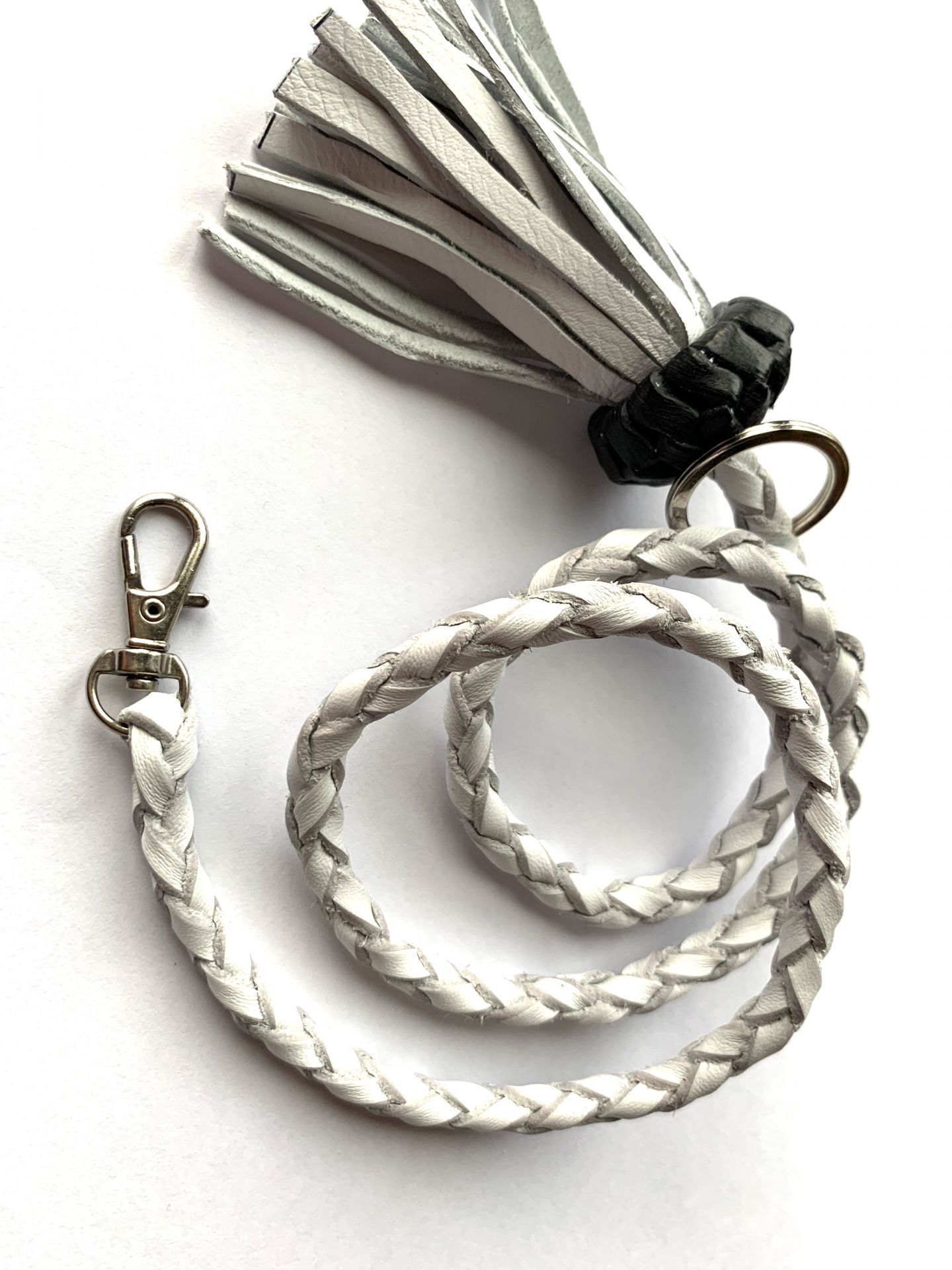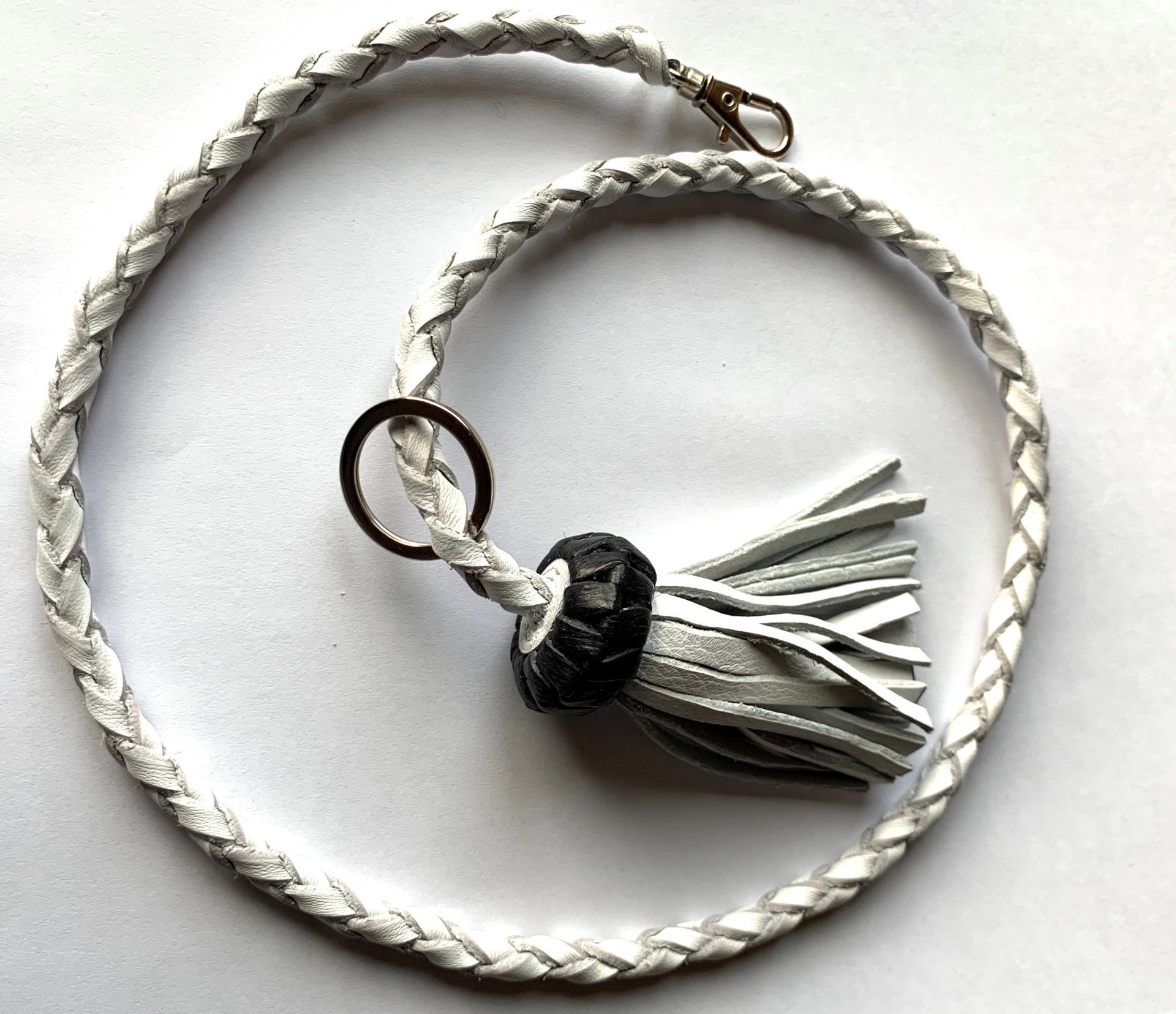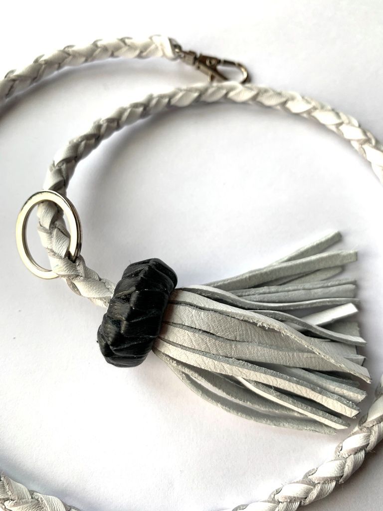 Cordón Blanco y Negro en redondo realizado en piel de vaca, de 60 Centímetros de largo con enganche clip metálico y acabado en nudo mosquero y aro metálico plateado.