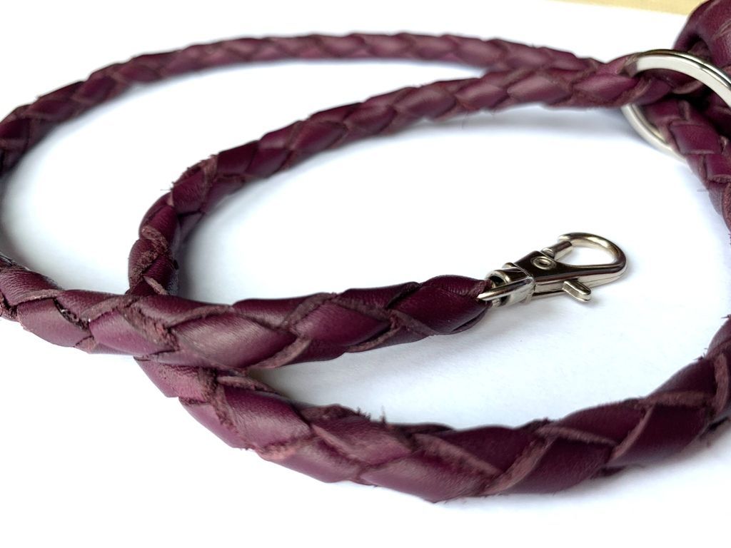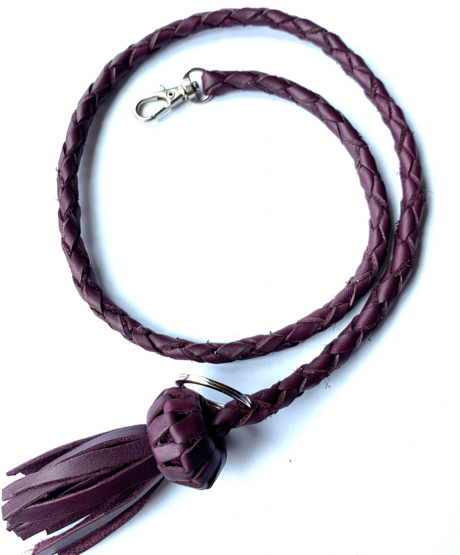 Cordón en redondo realizado en  piel de vaca,  de 60 Centímetros de largo con enganche clip metálico y acabado en nudo mosquero  y aro metálico plateado.