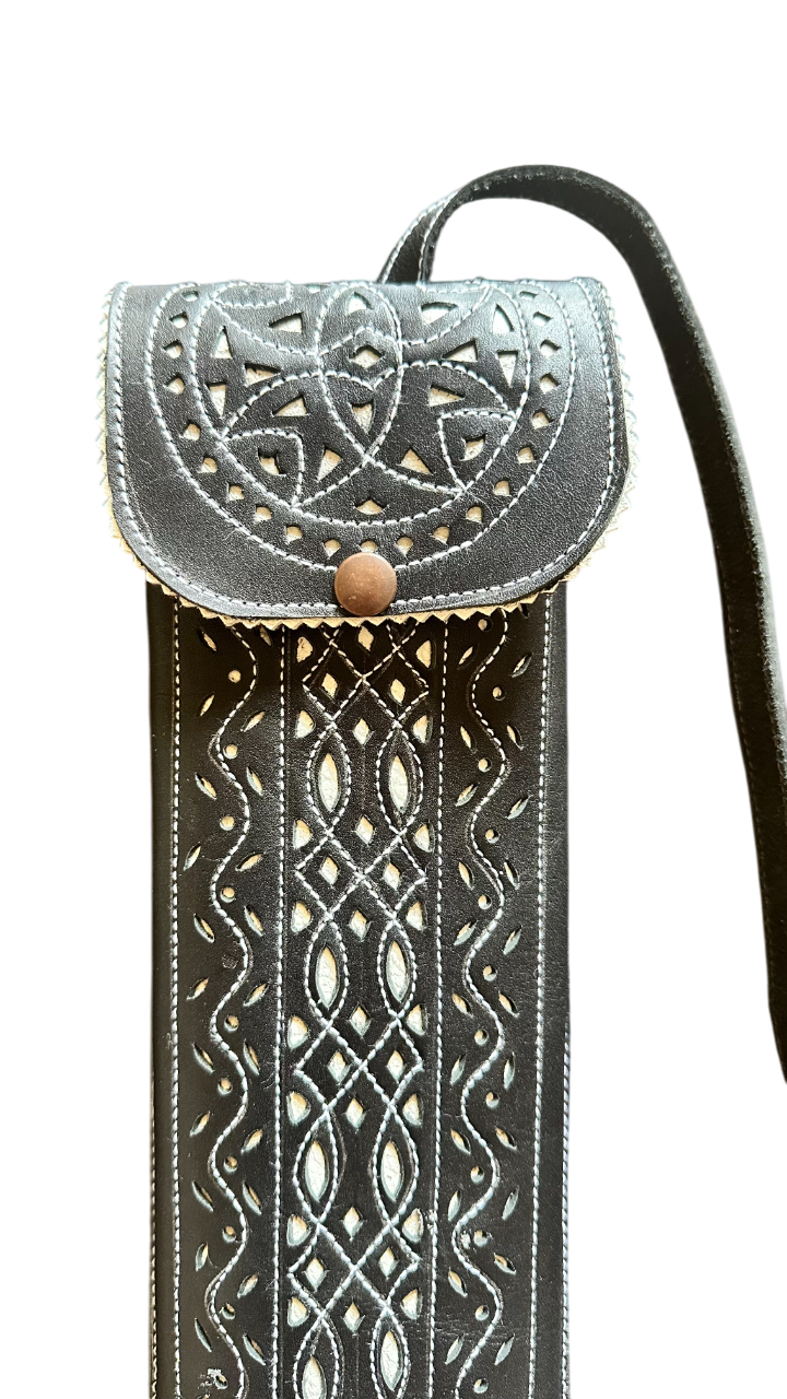 • Funda de cuero negra calado en color blanco y forrado en cuero, para dos gaitas charras y porra.