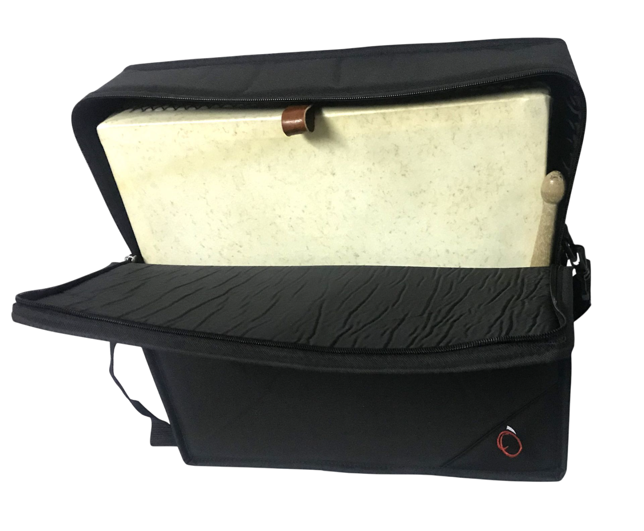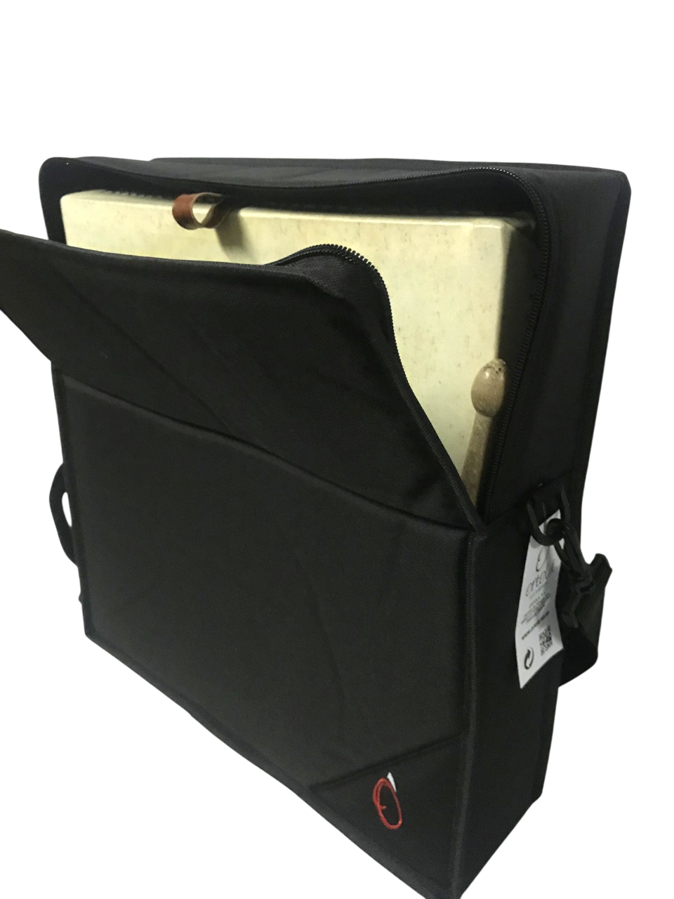Funda para pandero Cuadrado, fabricada en poliester plastificado y acolchado de 10 milímetros, con interior en poliester forrado negro y bandolera.