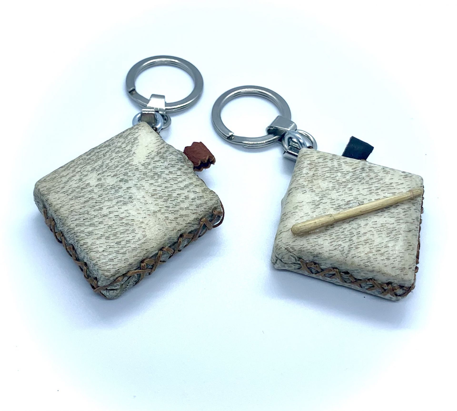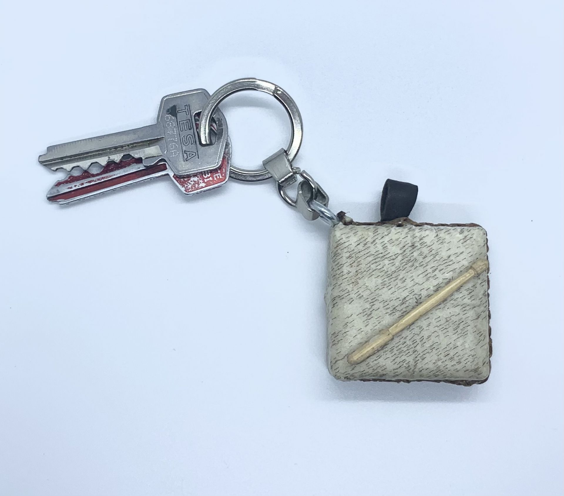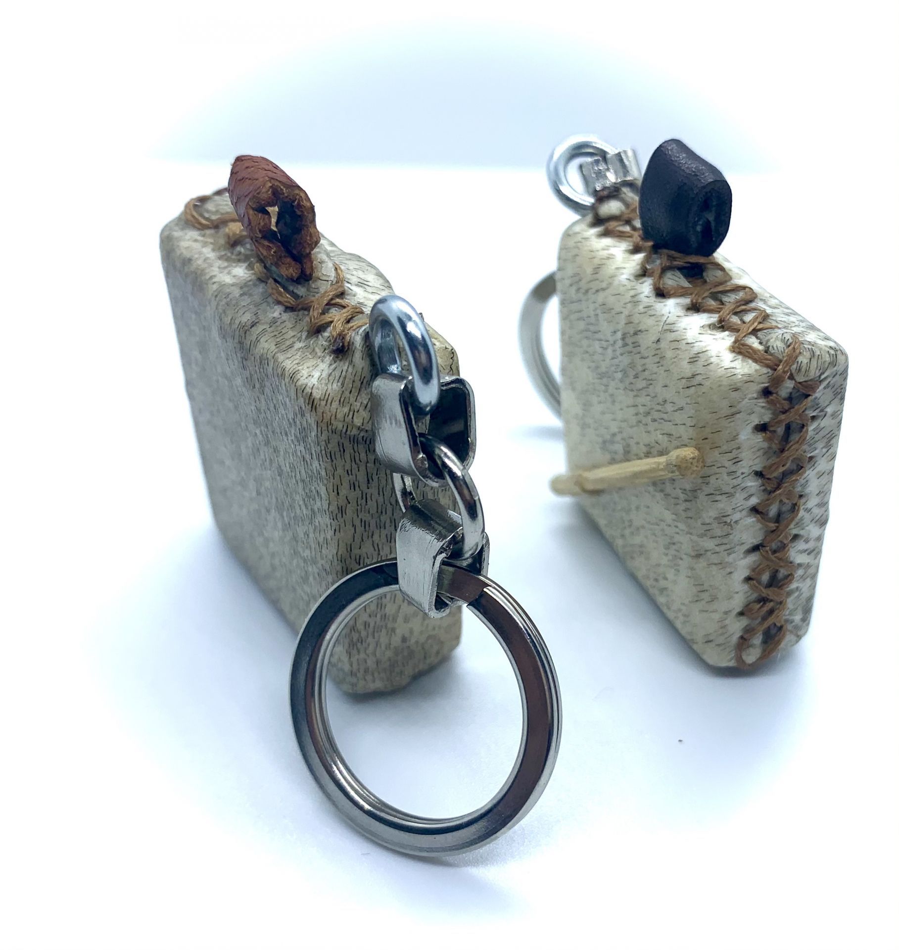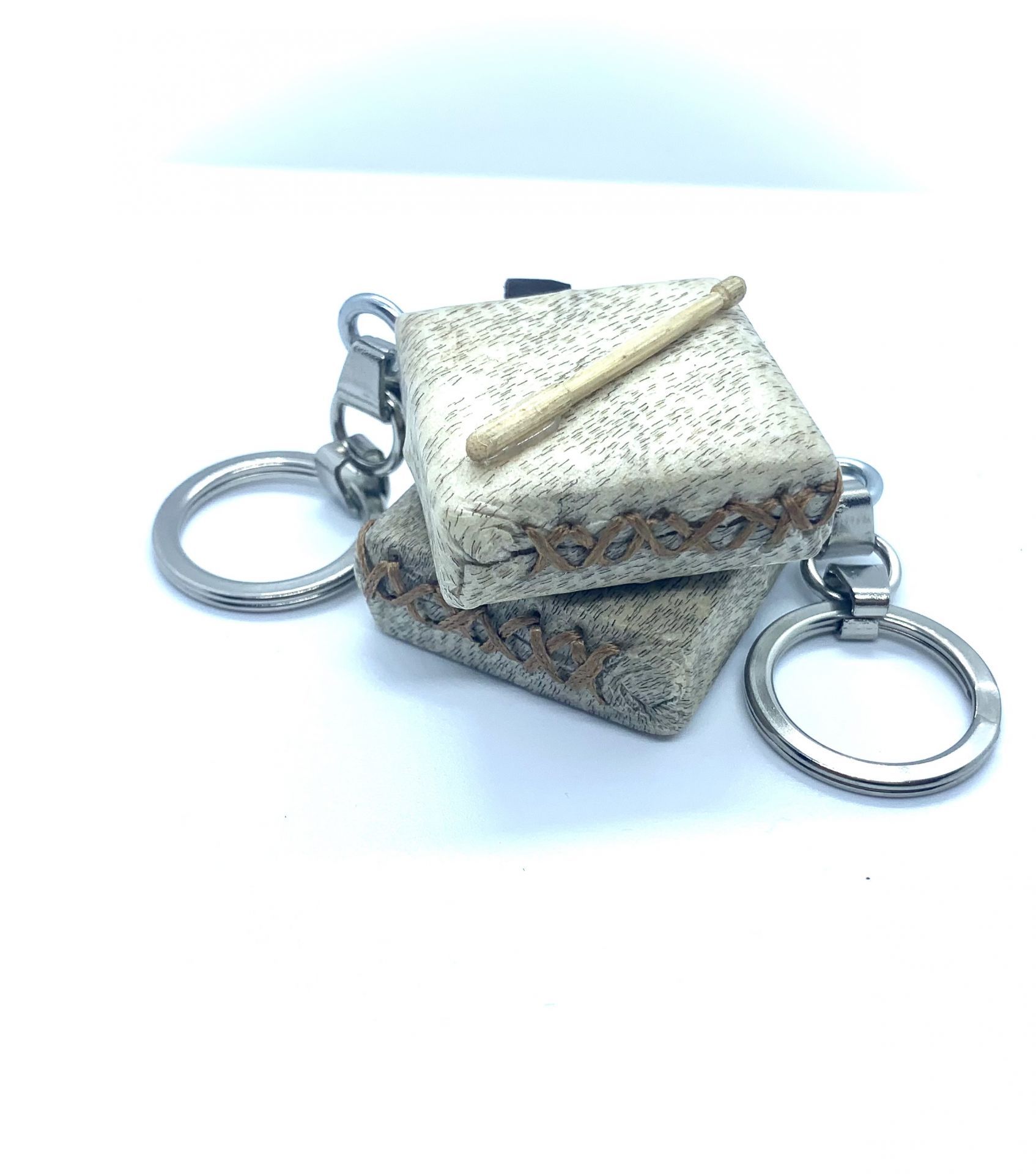 Creamos estos llaveros con madera y  piel de cabra,  cosido al igual que los panderos tradicionales que fabricamos para tocar.