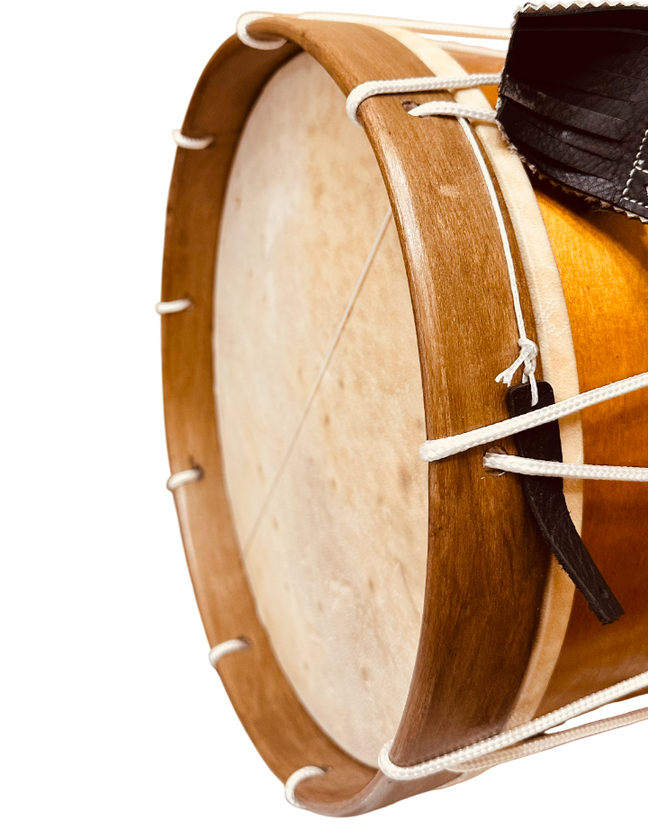 • Fabricamos los tamboriles con casco de madera de 8 mm en madera  de 33 centímetros de diámetro, curvado  y protegido con barniz y aceites naturales. La fabricación de una estructura de 8 mm de madera uniforme crea  una resistencia y durabilidad mucho mayor que el DM, y al no necesitar refuerzos en su interior dada la densidad y grosor funciona como una caja de resonancia limpia y fluida.