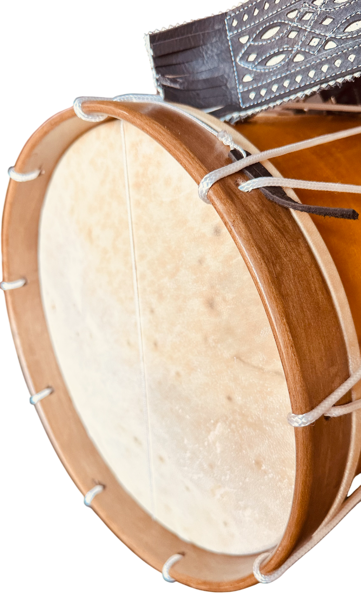 • Los parches son de piel de cabra natural, escogidos meticulosamente para generar un sonido potente y de gran resistencia, emparchados con aro de madera de Haya de 10x8 milímetros